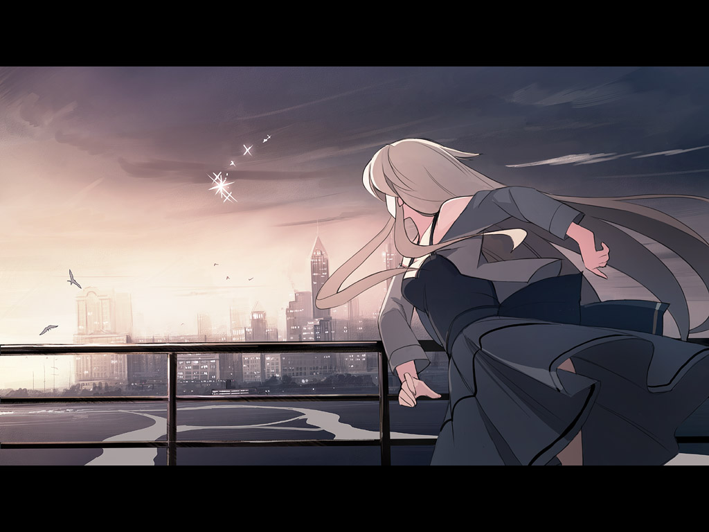bare shouldersbirdblonde haircamisolecitycityscapeletterboxedlong hairoceanoutdoorsskirtskysolowhite hair