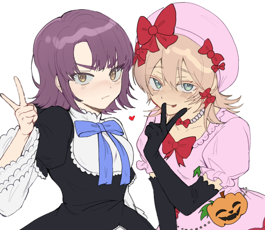 :p:t2girlsaqua eyesberetblack dressblack glovesblonde hairblue bowblushbowbrown eyeschokercosplaydressdress bowelbow glovesfrederica bernkastel (cosplay)frilled sleevesfrillsgloveshair between eyeshair bowhatheartjack-o'-lanternjack-o'-lantern ornamentjewelrylambdadelta (cosplay)layered dresslooking at viewermedium hairmultiple girlsnecklaceparted bangspearl necklacepink dresspink hatpoutpuffy short sleevespuffy sleevespurple hairred bowshort hairshort sleevessmiletonguetongue outupper bodyvv over mouthwhite backgroundwide sleeves
