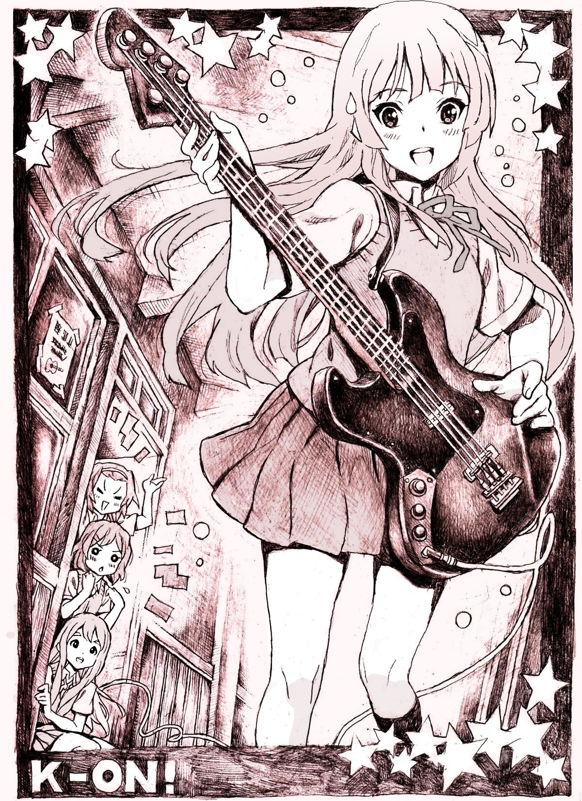 00s4girlsbass guitarblushcableguitarho-kago tea timeinstrumentlaughingleft-handedlong hairminiskirtmonochromemultiple girlspeekingpink themepleated skirtschool uniformskirtsmilesocksstandingsweatsweatersweater vest