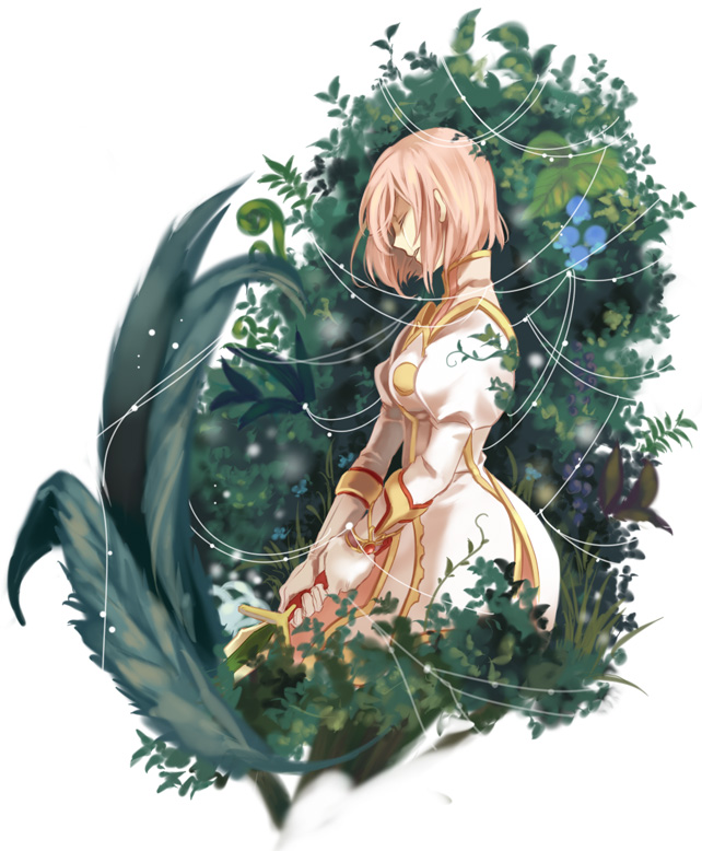 00s1girlclosed eyescryingdressfemale focusglovesgrassleafnaturepink hairshort hairsimple backgroundsoloswordtearsweaponwhite background