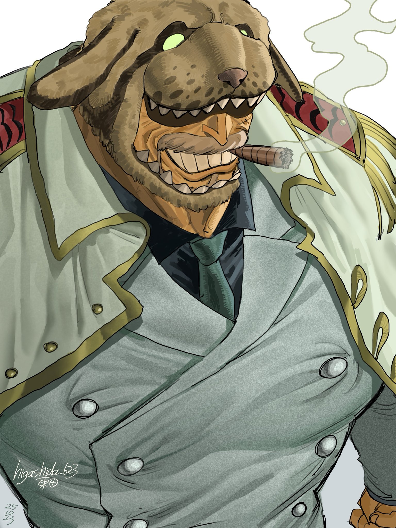 1boyanimal hoodbeardcigarcoatcoat on shouldersdog hoodepaulettesfacial hairgrinhoodlarge pectoralsmale focusmuscularmuscular malemustacheoldold manpectoralsshaded faceshort hairsmilesolothick mustache
