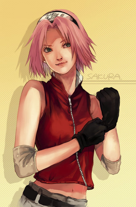 1girladjusting clothesadjusting glovesarm warmersbare shouldersbeltblack glovesbreastscharacter nameeyelashesfemale focusglovesgradient backgroundheadbandheaddresskonohagakure symbollight smilelipslooking to the sidenavelpink hairrealisticred shirtshadowshirtshort hairskirtsleevelesssleeveless shirtsmilesoloupper bodywhite skirtzipper