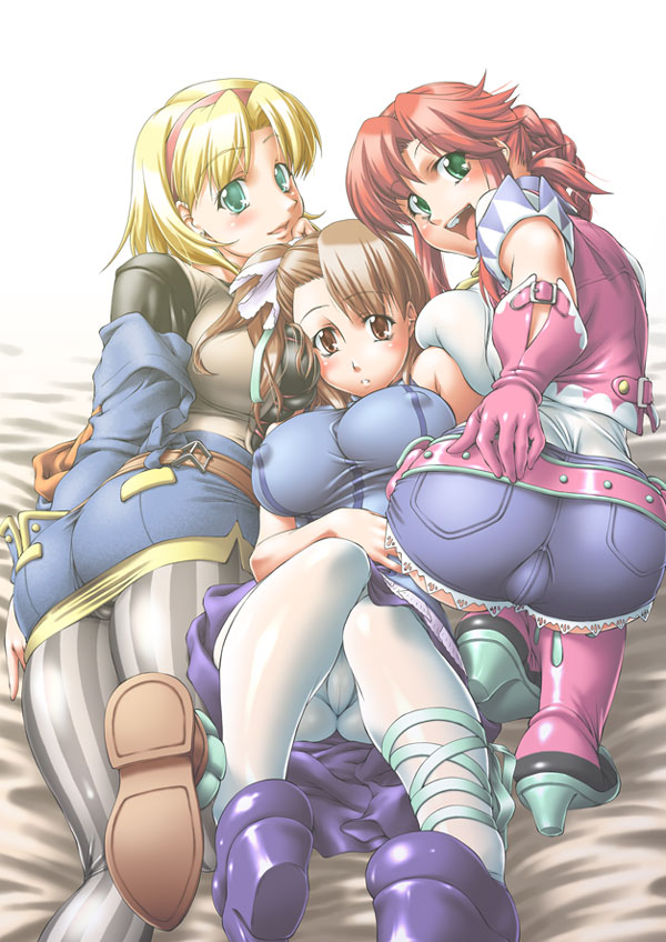 3girlsassbackboobbedbeltblonde hairblue shortsbootsbraidbreast pressbreastsbrown eyesbrown haircameltoecovered erect nipplescrotch seamdenimdenim shortsglovesgreen eyeshairbandin-franchise crossoverlarge breastslyingminiskirtmultiple girlson backpantyhosepink bootspink glovesred hairred hairbandshirtshortssingle braidskirtsmilestriped clothesstriped pantyhosetaut clothestaut shirtthighsvertical-striped clothesvertical-striped pantyhosewhite backgroundwhite pantyhose