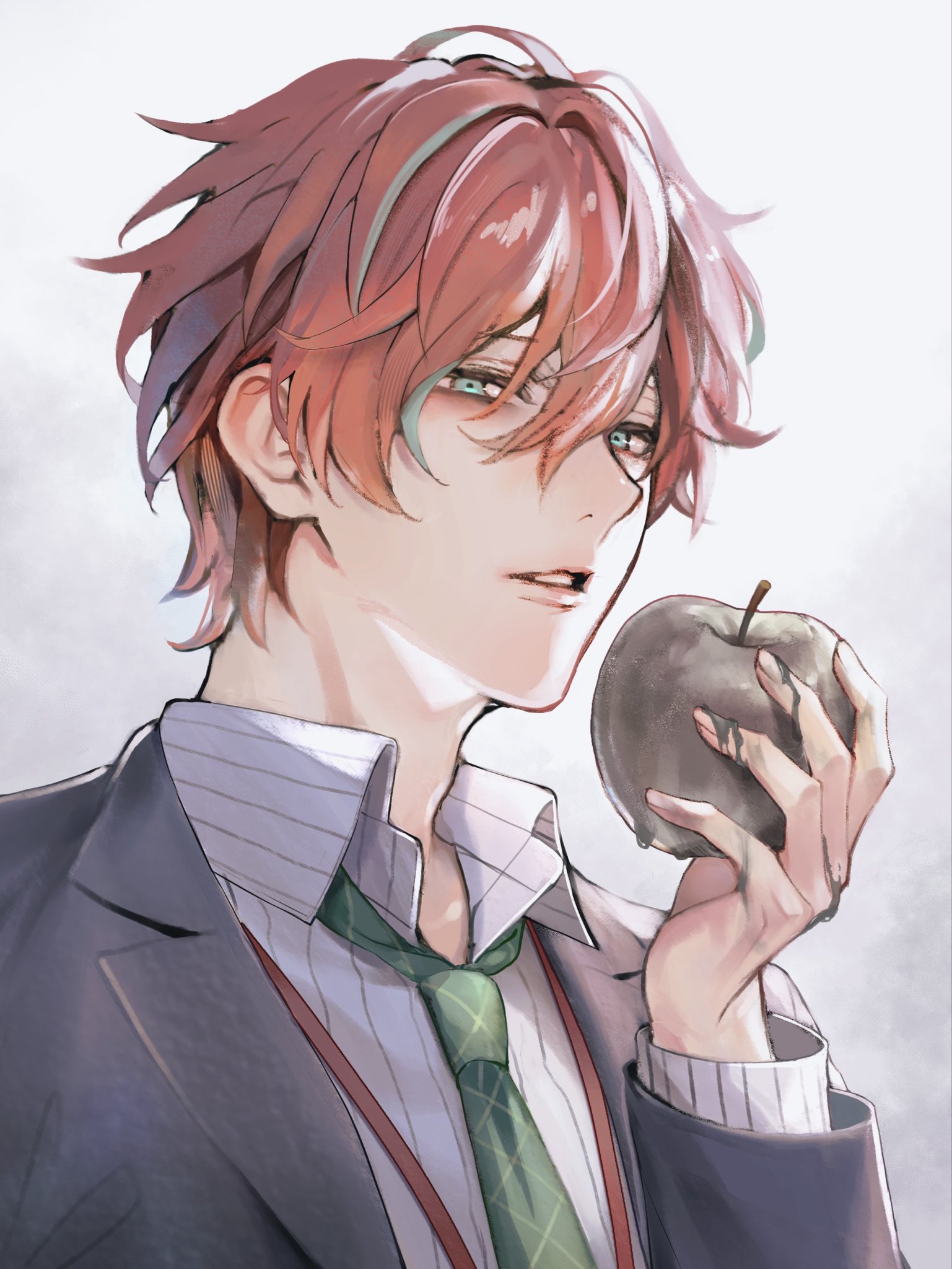 1boyapplecollared shirtfingernailsfoodfruitgreen eyesgreen hairgreen necktiehair between eyeshand upholdingholding foodholding fruitlapelslong sleevesmale focusmulticolored hairnecktienotched lapelsparted lipsred hairsakukaishirtshort hairsolostreaked hairtwo-tone hairupper body