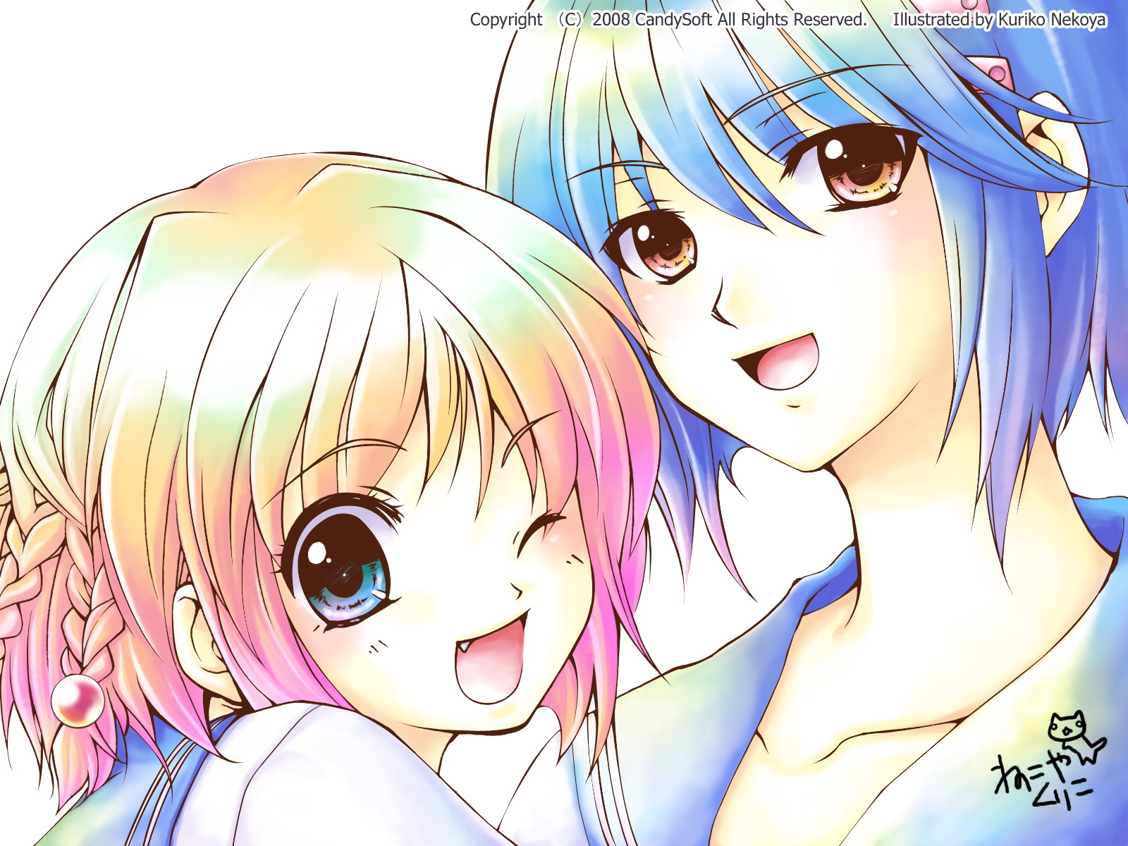 2girlsblonde hairblue hairblushbraidbrown eyesgreen eyeslooking at viewermultiple girlstaremeupper body