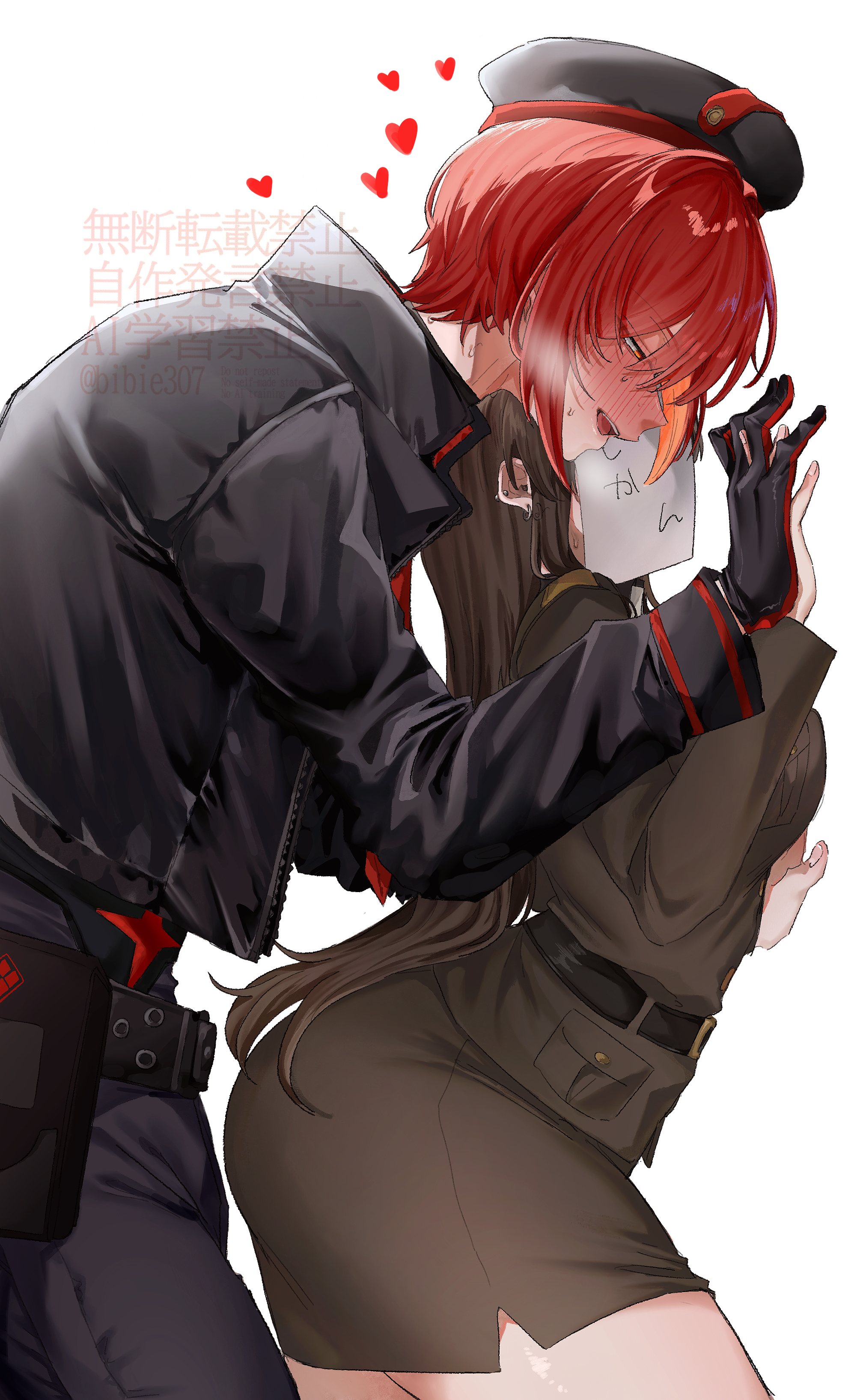 arched backbeltbelt buckleblack beltblack glovesblack jacketblack pantsblushbreastsbrown hairbrown shirtbrown skirtbucklecropped legsear piercinggenderswapgenderswap (ftm)genderswap (mtf)glovesheartjacketlarge breastsleaning forwardlong sleeveslooking at anotheropen clothesopen jacketopen mouthpantspaper on headpiercingred eyesred hairshirtsimple backgroundskirtsmilestandingteethupper teeth onlywhite backgroundzipper