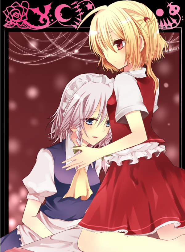 2girlsblonde hairblue eyesfemale focusgradient backgroundmaidmultiple girlsred eyesshort hairskirt