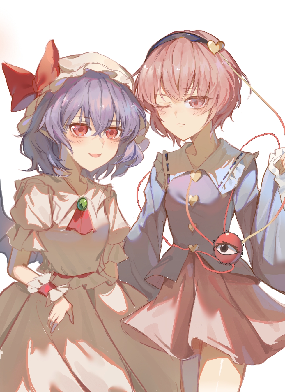 2girlsascotblack hairbandblushbowclosed mouthcollarcollared shirtcrossed bangsfangfrilled collarfrilled cuffsfrilled sleevesfrillshair between eyeshairbandhathat bowheartheart of stringmob capmultiple girlsone eye closedparted lipspink hairpink hatpink skirtpointy earspuffy short sleevespuffy sleevespurple hairpurple shirtred ascotred bowred eyesshirtshort hairshort sleevessimple backgroundskirtsmilethird eyewhite backgroundwhite shirtwhite skirtwrist cuffs