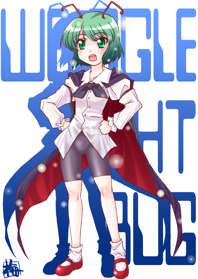 1girlantennaebike shortsbugcapefemale focusfirefliesfireflygreen eyesgreen hairhands on own hipsmary janesmatching hair/eyesshoesshort hairsolo