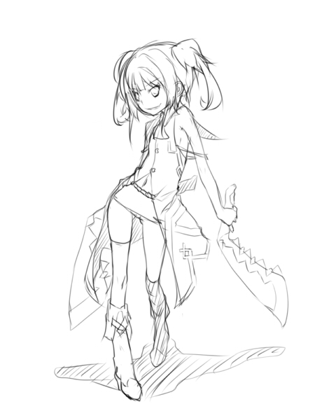 1girlbootsfemale focusfull bodygreyscaleminiskirtmonochromenavelshoesshort hairskirtsleevelesssmilesolostandingtwintailsweapon