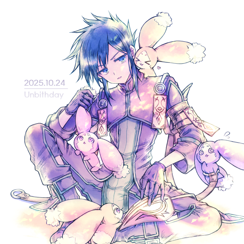 1boyblack glovesblue eyesbootscheaglecreaturedateddizzyflying sweatdropsglovesgreen hairheartholding another's earjacketknee uplong sleevesmale focusmasknainainame774on shoulderpantsparted lipsshort hairsidelockssimple backgroundsittingspiked hairunworn maskwhite background