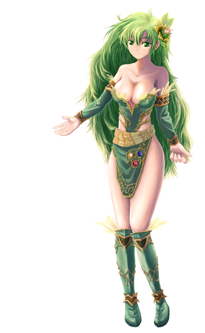 1990s (style)1girlaged upbare shouldersbootsbreastscleavagedetached sleevesfemale focusflowergreen bootsgreen eyesgreen hairhair ornamentlarge breastslong hairmatching hair/eyesretro artstylerevealing clothessimple backgroundsolovery long hair