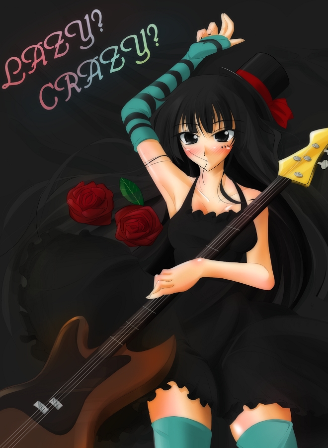 00s1girlbare shouldersbass guitarblack eyesblack hairblushdresselbow glovesfemale focusfingerless glovesflowergloveshair in own mouthhatinstrumentlong hairlyingmini hatmini top hatrosesolothighhighstop hatzettai ryouiki