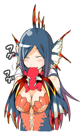 1boy1girlbare shouldersblue hairblue skinblushbreastscenter openingclawscleavageclosed eyescolored skineatingfacial markfemale focusfinsfish girlfroggradient hairhappyhead finsholdinglarge breastslong hairmonster girlmulticolored hairparted bangspersonificationpurple hairred hairsidelockssimple backgroundsmilesoloupper body