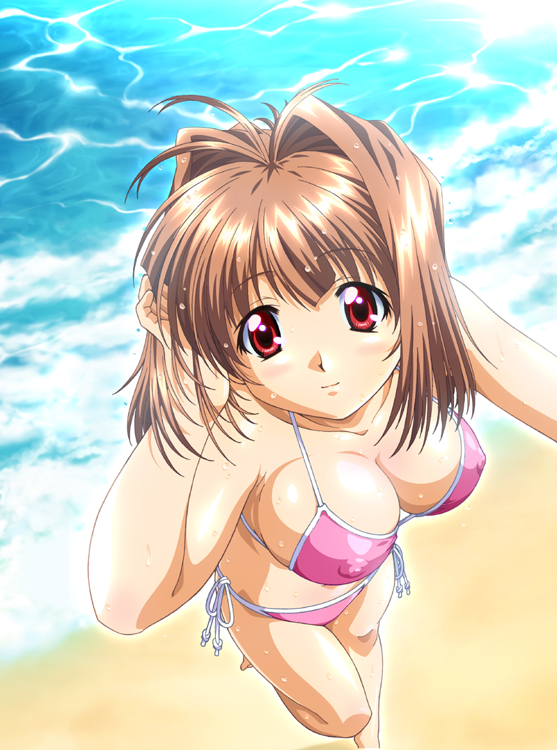 1girladjusting hairantenna hairbeachbikinibreastsbrown haircausticscleavagecovered erect nipplesdayfemale focusforeshorteningfrom abovefront-tie bikini topfront-tie tophair intakeshalternecklarge breastsoutdoorspink bikinired eyesshort hairside-tie bikini bottomsolostandingstanding on one legstring bikiniswimsuitwet