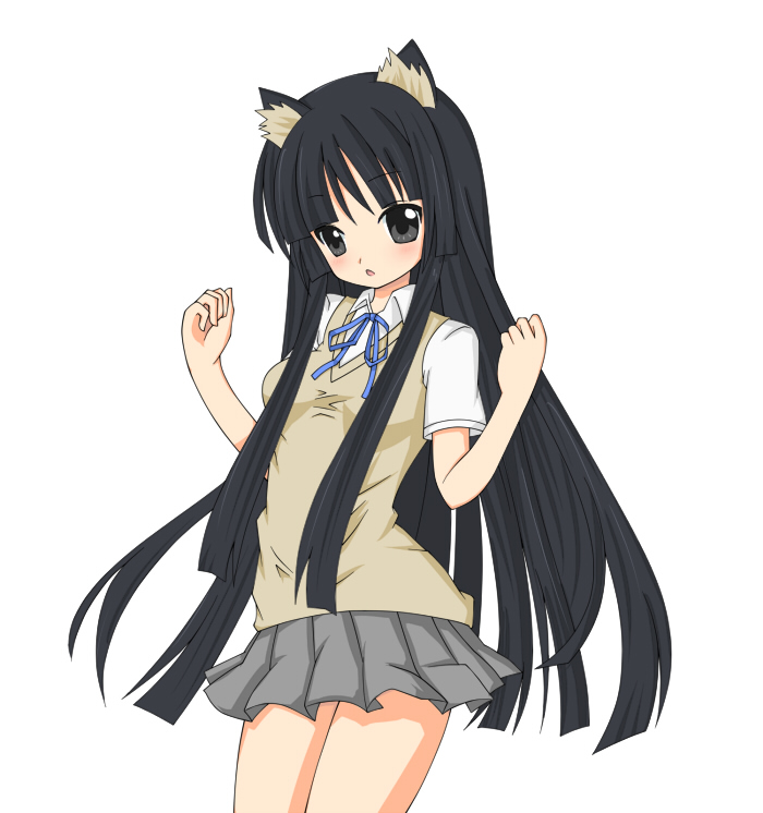 :o00s1girlanimal earsblack eyesblack hairblunt bangsblushcat earscat girlfemale focushime cutlong hairminiskirtpleated skirtribbonschool uniformsimple backgroundskirtsolostandingsweatersweater vestvery long hairvest