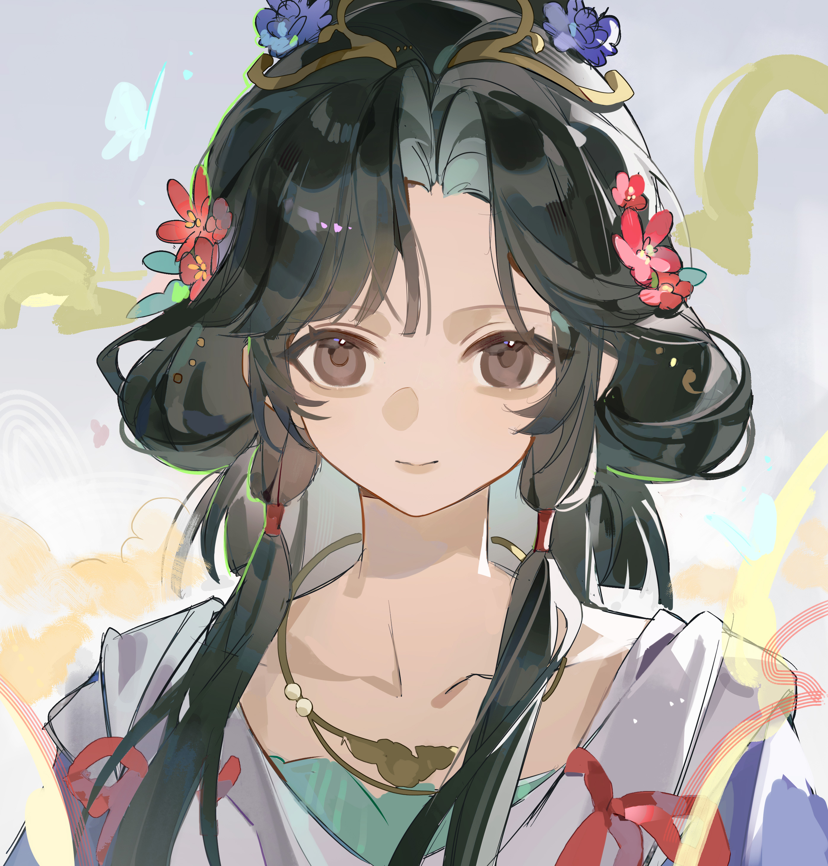 1girlblack eyesblack hairchinese clothesclosed mouthflowergrey backgroundhagoromohair flowerhair ornamenthanfulong hairofficial alternate costumeparted bangsportraitpurple flowerred flowershawlsmilesoloyellow shawl