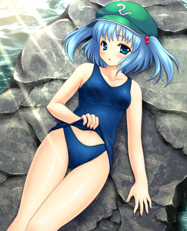 1girlblue eyesblue hairfemale focushair bobbleshair ornamentlyingmatching hair/eyesmidriffone-piece swimsuitschool swimsuitschool swimsuit flapshort hairsoloswimsuittwintailstwo side up