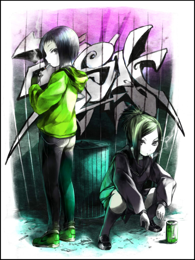 2girlsblack eyesblack hairbob cutcancigarettegreen hairhoodhoodieminiskirtmulticolored hairmultiple girlsmuralpantspleated skirtschool uniformserafukushoesshort hairskirtsmokingsockssquattingstandingtwo-tone hair