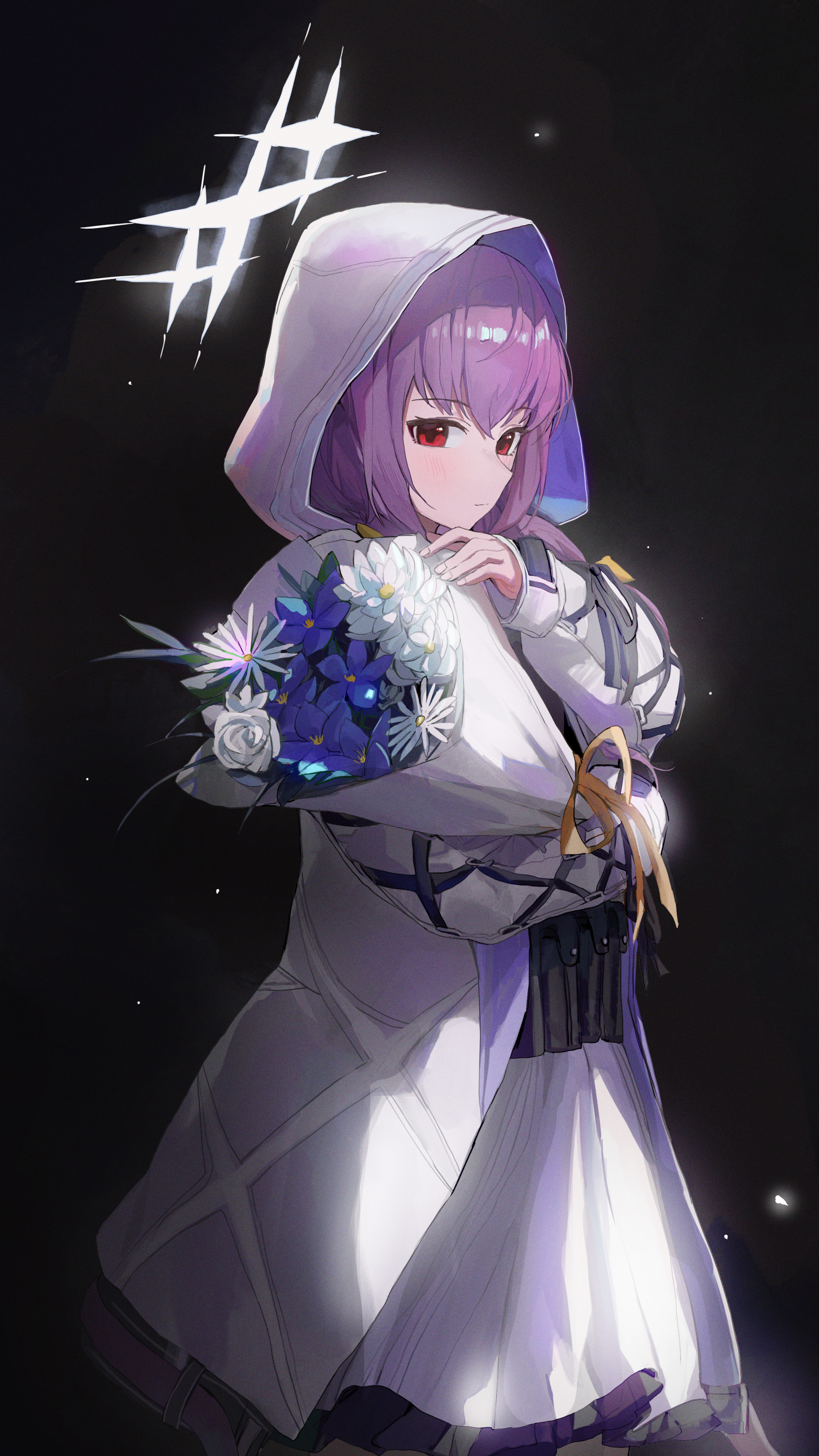 1girlblue flowerblushbouquetbulletproof vestclosed mouthdressflowerhair between eyeshaloholdingholding bouquethoodhood uplight smilelong hairlooking at viewerpurple hairred eyessolowhite dresswhite flowerwhite halo