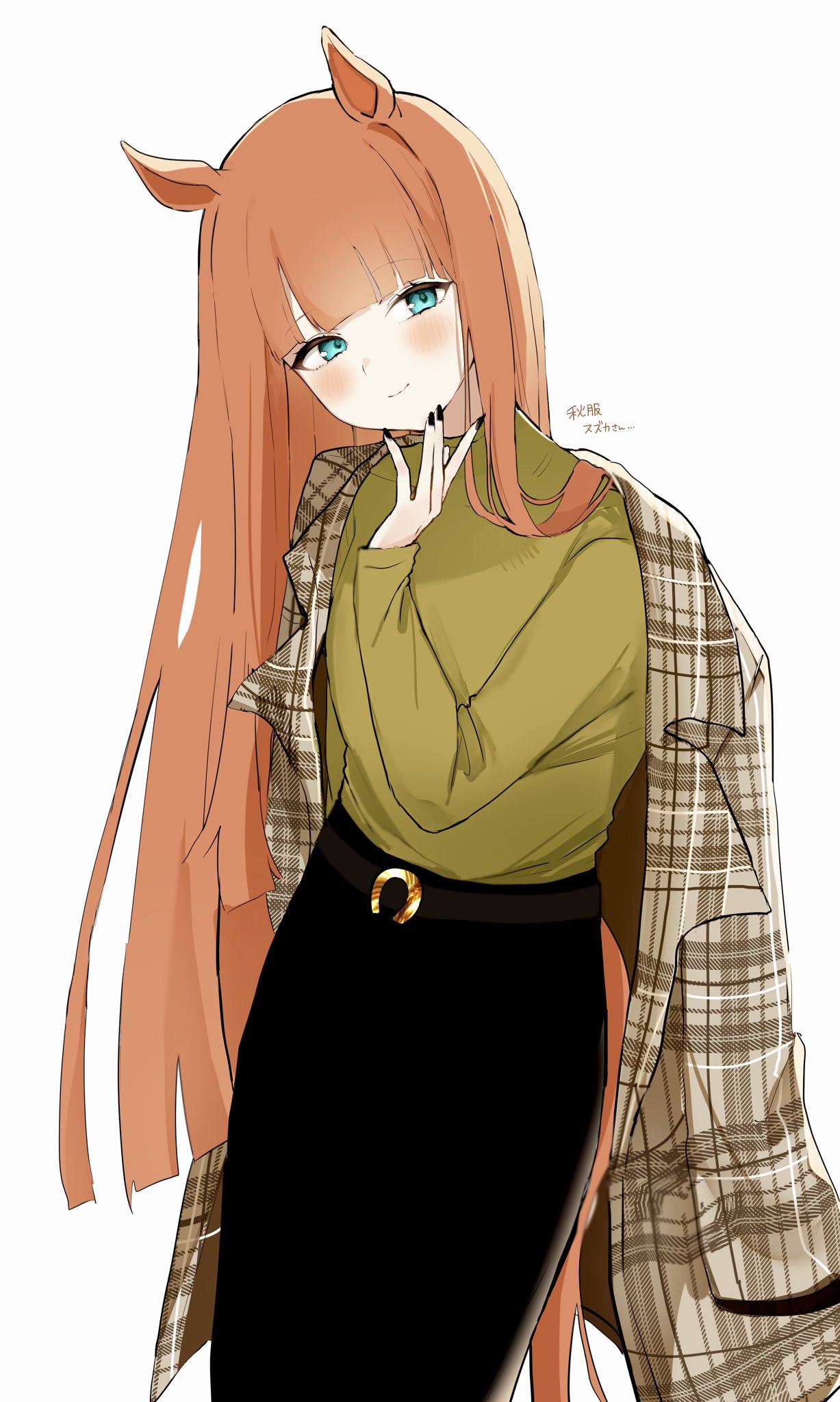 1girlalternate costumeaqua eyesbeltblack skirtblunt bangscoatcoat on shouldersgreen sweaterhorse girlhorseshoe ornamentlong hairlong sleeveslooking at viewerorange hairplaid clothesplaid coatsimple backgroundskirtsmilesolosweaterwhite background
