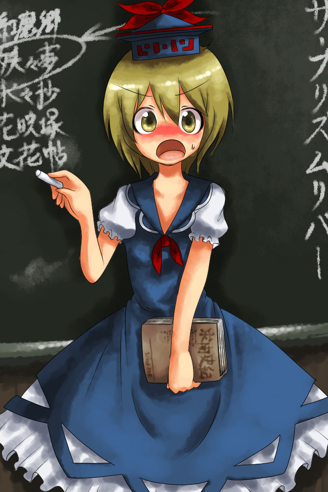 1girlblonde hairblushbookchalkboardcosplayfemale focushathistory lessonkamishirasawa keine (cosplay)short hairsolostandingyellow eyes