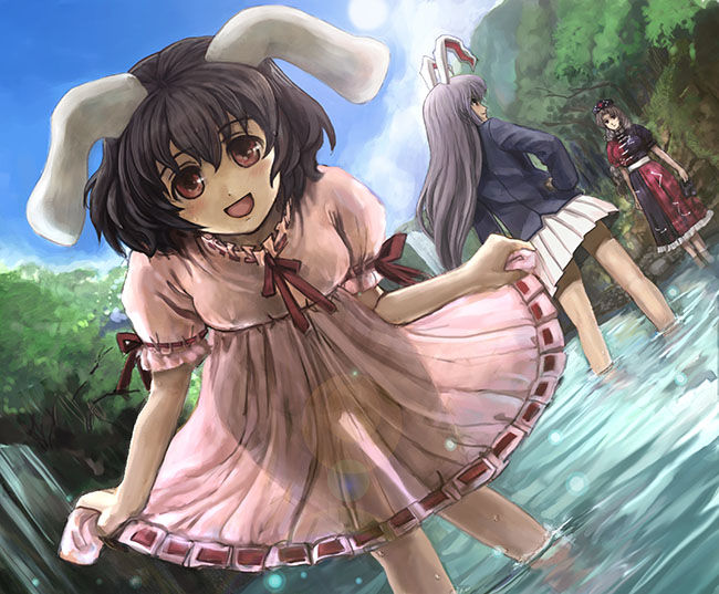 3girlsanimal earsblack hairblazerbob cutclothes liftdaydressdress liftdutch anglefemale focusjacketlaughingleaning forwardlong hairminiskirtmultiple girlspleated skirtpurple hairrabbit earsred eyessee-through clothesshort hairsidelocksskirtskirt holdskysmilestandingwadingwater
