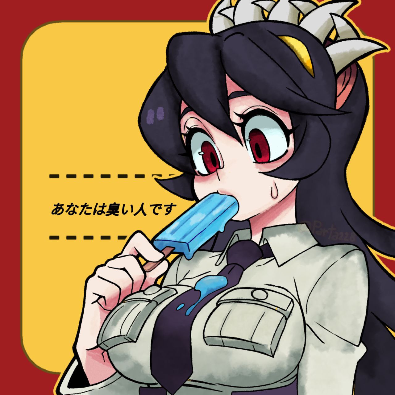 1girlfoodholdingholding foodholding popsiclenecktieparta 228popsiclered eyesshirtsweatdropteeth