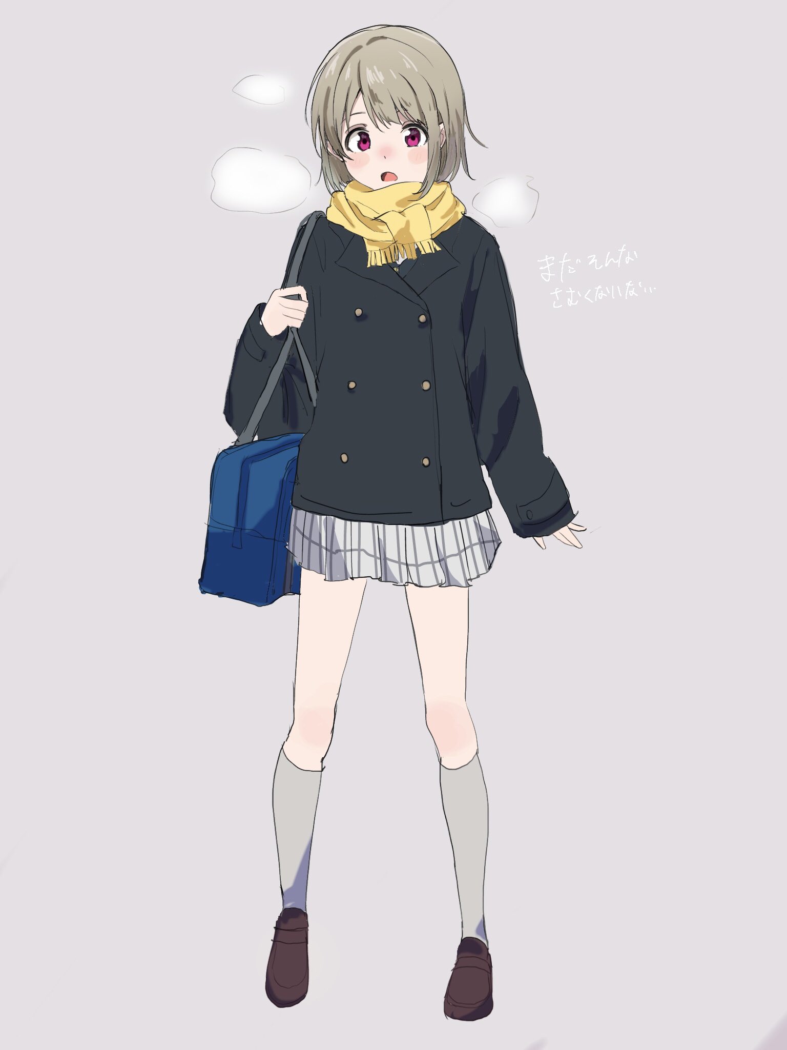 1girlbagblack jacketblushbob cutbreathbrown hairfull bodygrey backgroundgrey skirtgrey socksjacketkneehighslooking at viewernijigasaki school uniformopen mouthplaid clothesplaid skirtpleated skirtred eyesscarfschool bagschool uniformshoesshort hairsimple backgroundskirtsleeves past wristssockssoloyellow scarf