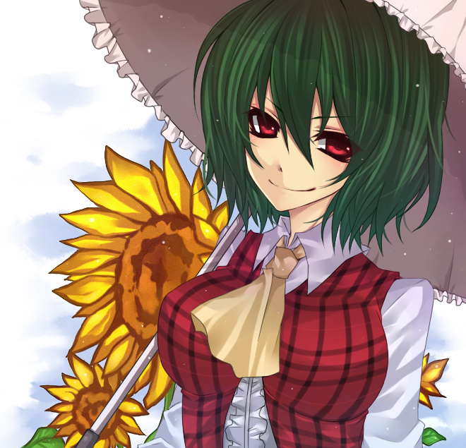 1girlascotbreastsfemale focusflowergreen hairlarge breastsplaid clothesplaid vestred eyesshort hairsmilesolosunflowerumbrellaupper bodyvest