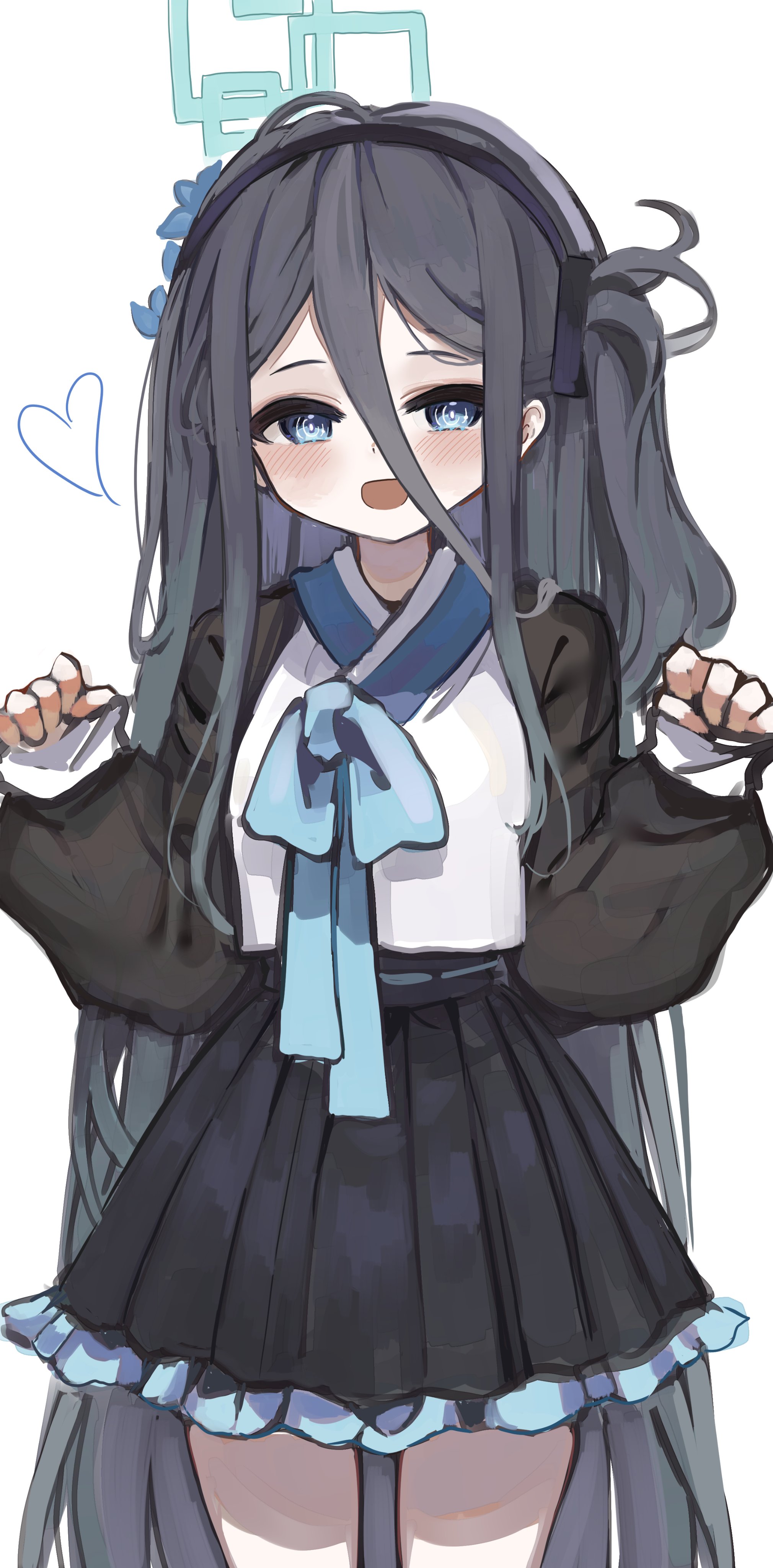 1girlblack hairblack hairbandblack jacketblack skirtblue bowblue eyesblue flowerblue haloblushbowclenched handscowboy shotflowerfrillshair between eyeshair flowerhair ornamenthairbandhalohands upheartjacketlong hairlong hair between eyeslong sleeveslooking at viewerone side upopen clothesopen jacketopen mouthpleated skirtpuffy long sleevespuffy sleevesshirtsidelockssimple backgroundskirtsmilesolovery long hairwhite backgroundwhite shirt