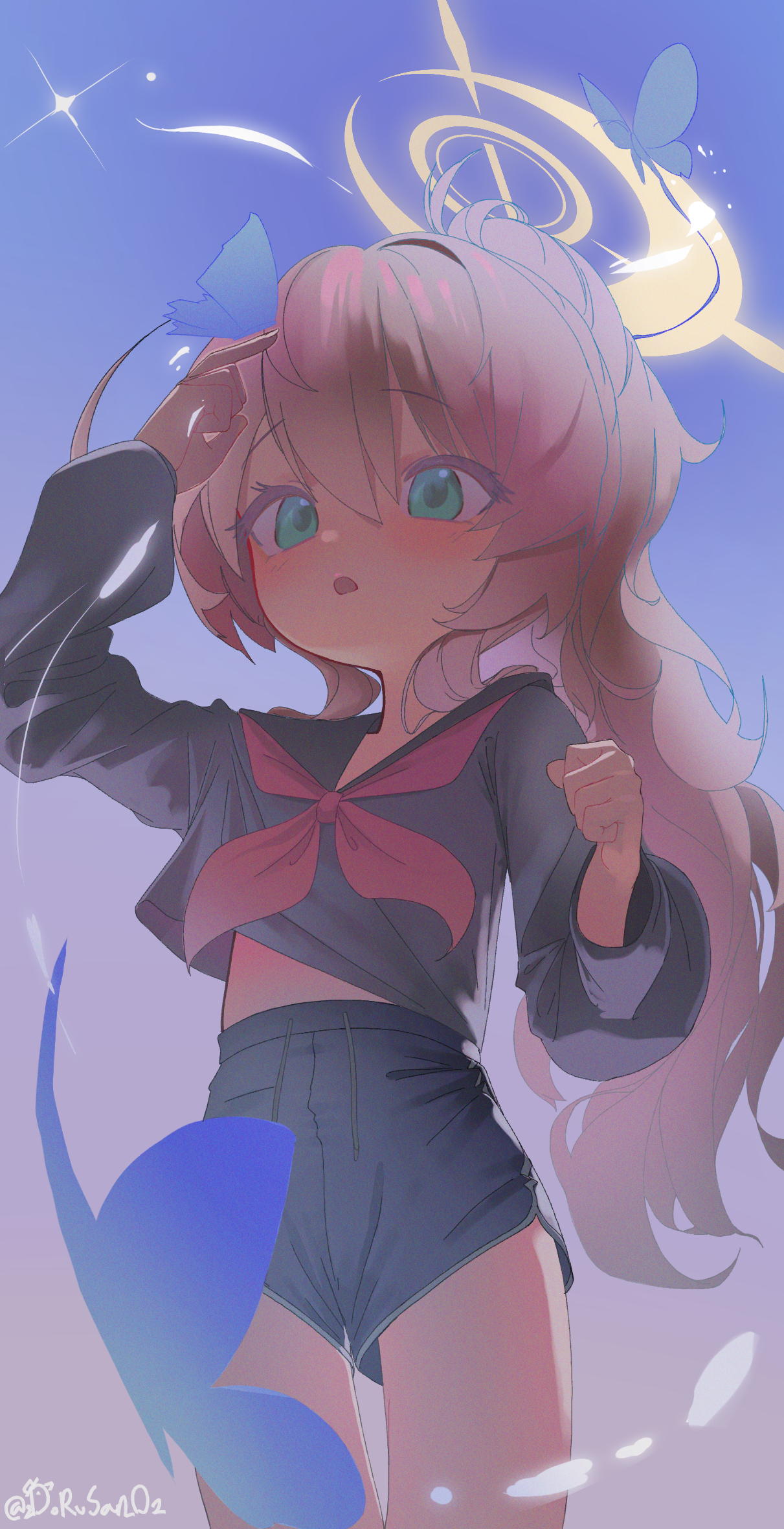 1girlartist nameblack shirtblue shortsbugbutterflydolphin shortsgreen eyeshaloinsectlong hairlong sleevesneckerchiefopen mouthred neckerchiefshirtshortssignaturesoloyellow halo