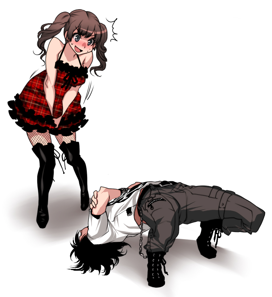 1boy1girlarched backblushbootsbrown haircovering crotchcovering privatesdressfishnetspantspeekingsimple backgroundstandingthighhighstwintailswhite background
