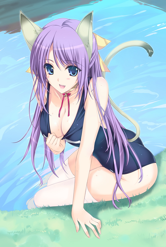 1girlanimal earsbreastscat earscat tailcleavagefemale focuslarge breastsone-piece swimsuitschool swimsuitsoloswimsuittailthighhighs