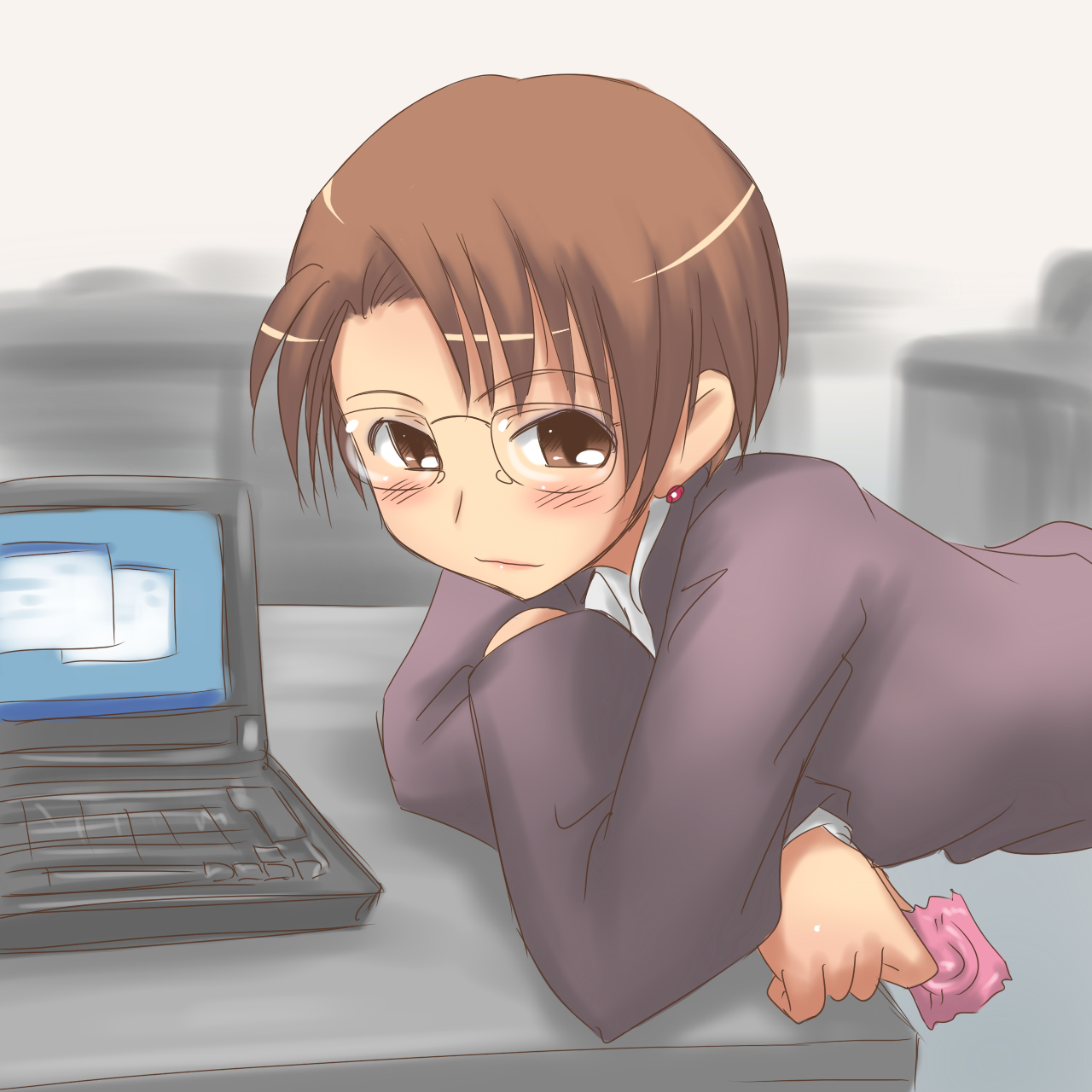 1girlblushbrown eyesbrown haircomputercomputer keyboardcondomcondom wrapperfemale focusglasseslaptopleaningoffice ladyshort hairsolo
