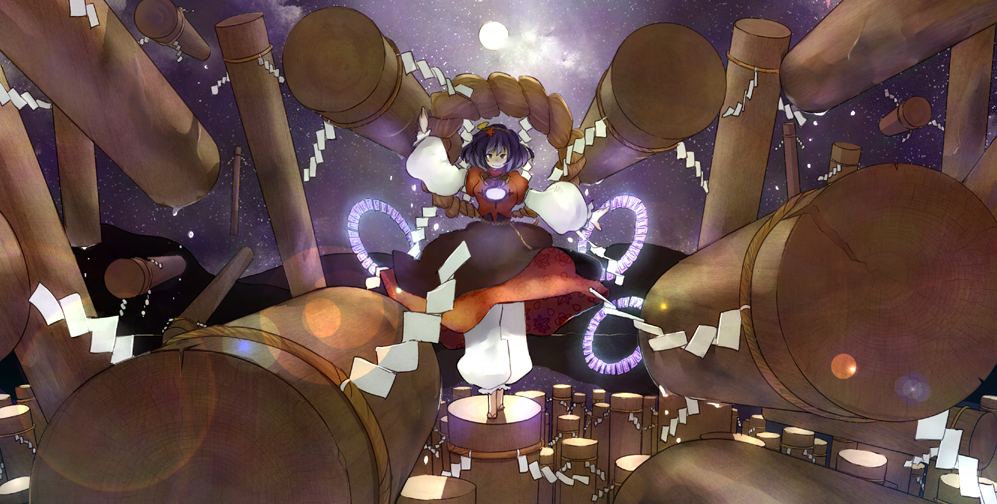 1girlblue hairdanmakufemale focusforeshorteningmoononbashirared eyesropeshideshimenawashort hairsolo