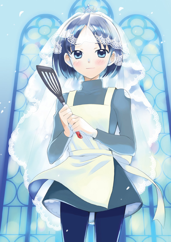 1girlapronblack pantyhoseblue eyesblue hairblushbridal veilfemale focusmatching hair/eyespantyhoseshort hairskirtsolospatulaveil