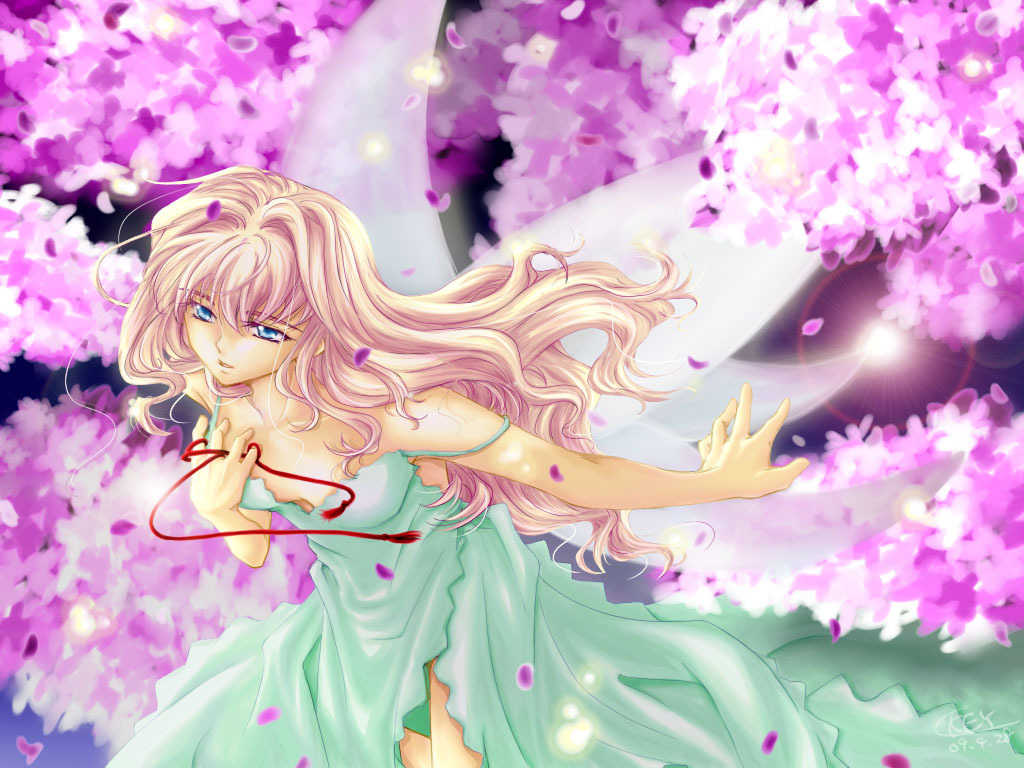 blaze (blazeillust), hinaichigo, rozen maiden, 00s, 1girl, aqua eyes, blonde hair, bow, bureizu, food, fruit, name connection, object namesake, pink bow, strawberry
