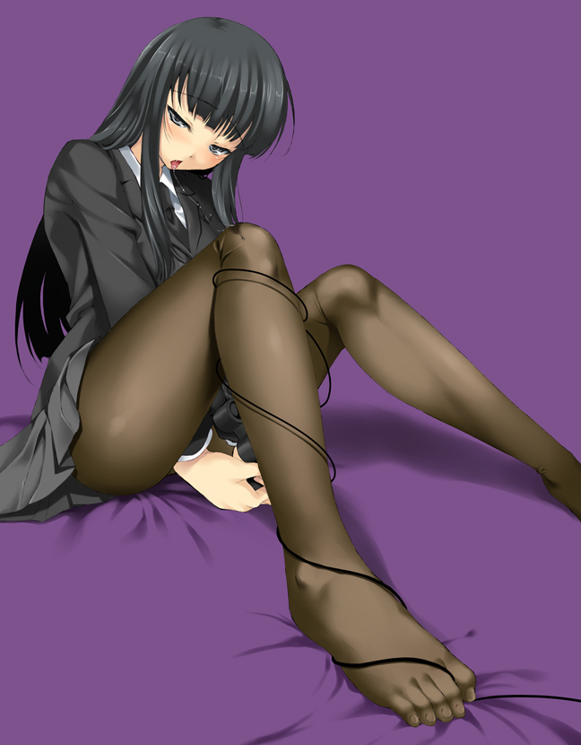 1girlblack hairblunt bangscontrollerfeetfemale focusgame controllergamepadgrey eyeslong hairnaughty facenecktiepantyhosesalivaschool uniformsittingsolotongue