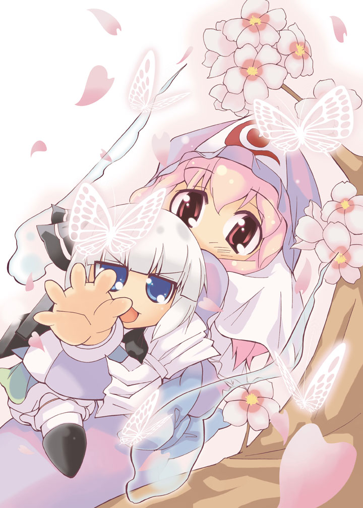 2girlsblue eyesbugbutterflycherry blossomschibifemale focusghosthair ribbonhathitodamamultiple girlspetalspink eyespink hairribbonshort hair