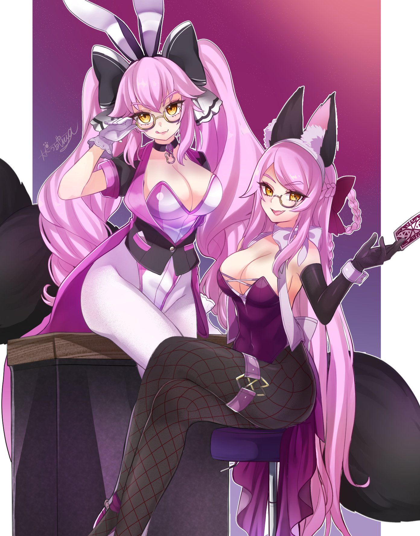 animal earsbraidcardfishnet pantyhosefishnetslong hairlooking at viewerpantyhosepink hairplaying cardrabbit earstwintailsyellow eyes