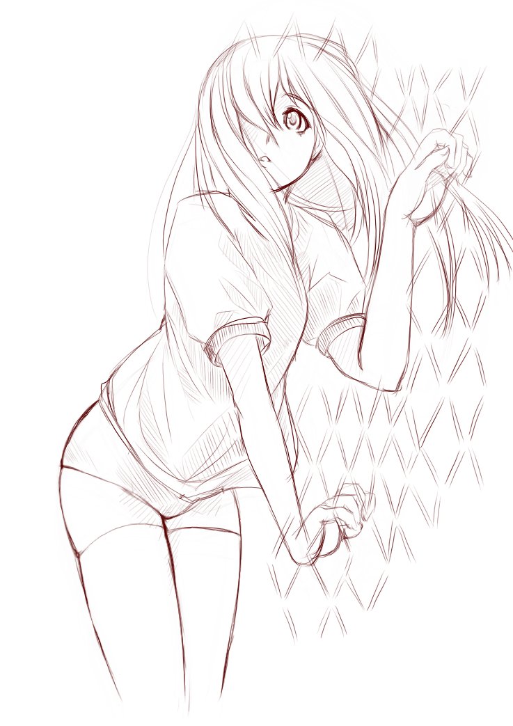 10s1girlbrown themeburumafemale focusfencegym uniformhair over one eyelong hairmonochromesimple backgroundsketchsolothighhighswhite background