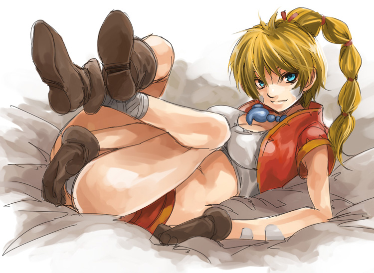 k ototo, yoko littner, tengen toppa gurren lagann, traditional media, 00s, 1girl, bikini, bikini top only, boots, bracelet, breasts, female focus, fingerless gloves, gloves, jewelry, long hair, medium breasts, ponytail, red hair, scarf, short shorts, shorts, smile, solo, swimsuit, thighhighs, underboob, unzipped, very long hair, yellow eyes, zipper