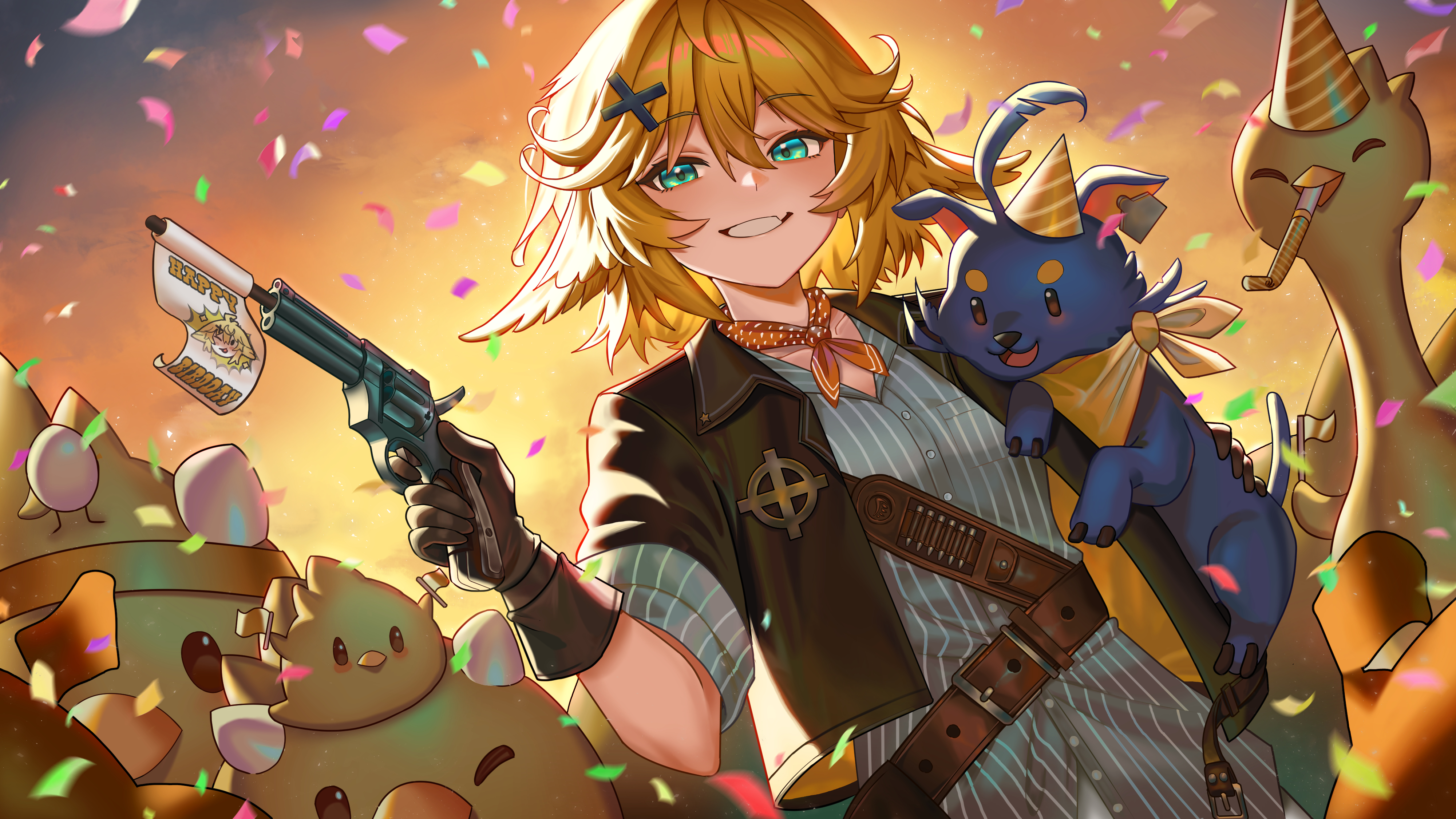 1girlanimalaqua eyesbacklightingballoonbandolierbeltbirdbirthdayblack dogblonde hairblue shirtbreast pocketbrown beltbrown glovesbrown jacketcollarbonecollared shirtconfetticropped jacketcrosshairdogdouble-parted bangsdutch angleear tageggenglish textfangfeather hairflagflag gunglovesgunhair between eyeshair ornamenthandgunhappy birthdayhatholdingholding animalholding gunholding weaponjacketneckerchiefnumber candleopen clothesopen jacketparted lipsparty hatparty hornpocketred neckerchiefrevolvershirtshort hairshort sleevesshort-sleeved jacketskin fangskysmilesolo focusstriped clothesstriped shirttoy guntwo-sided fabrictwo-sided jacketuntucked shirtupper bodyvertical-striped clothesvertical-striped shirtvirtual youtuberweaponx hair ornamentyellow birdyellow jacketyellow sky
