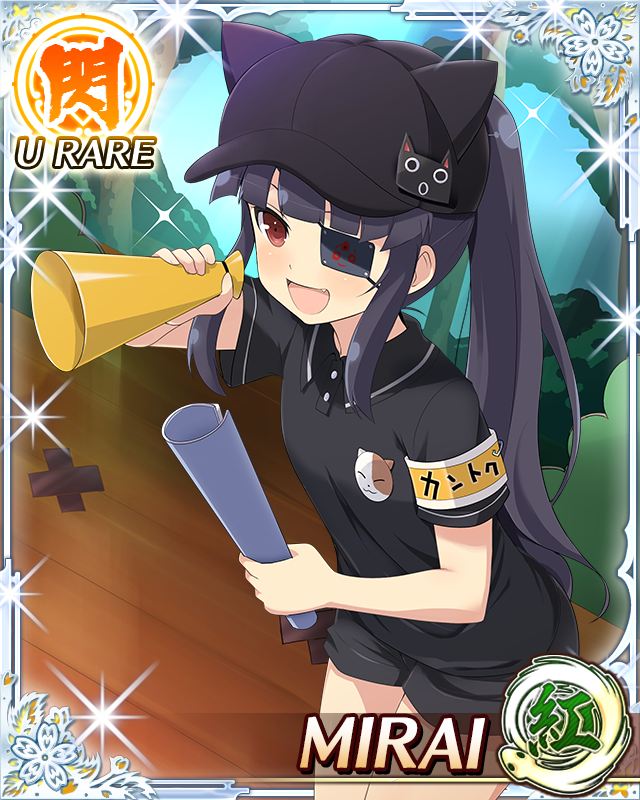 1girlanimal ear headwearblack hairblack shirtblunt bangsbordercard (medium)directoreyepatchfake animal earsfilm setflat chestholdingholding megaphonelong hairmegaphonemitsudomoe (shape)official alternate costumeofficial alternate hairstyleopen mouthred eyesrolled up paperscriptshirtshortssmilesolostudiotomoe (symbol)