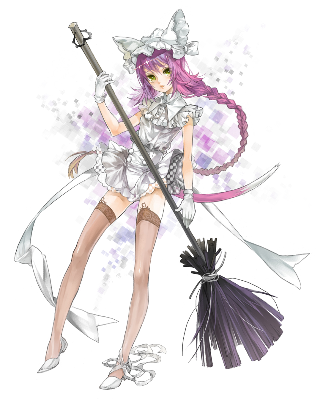 animal earsbraidbroomcat earscat tailglovesgreen eyesmaidponytailpurple hairsingle braidsolotailthighhighs