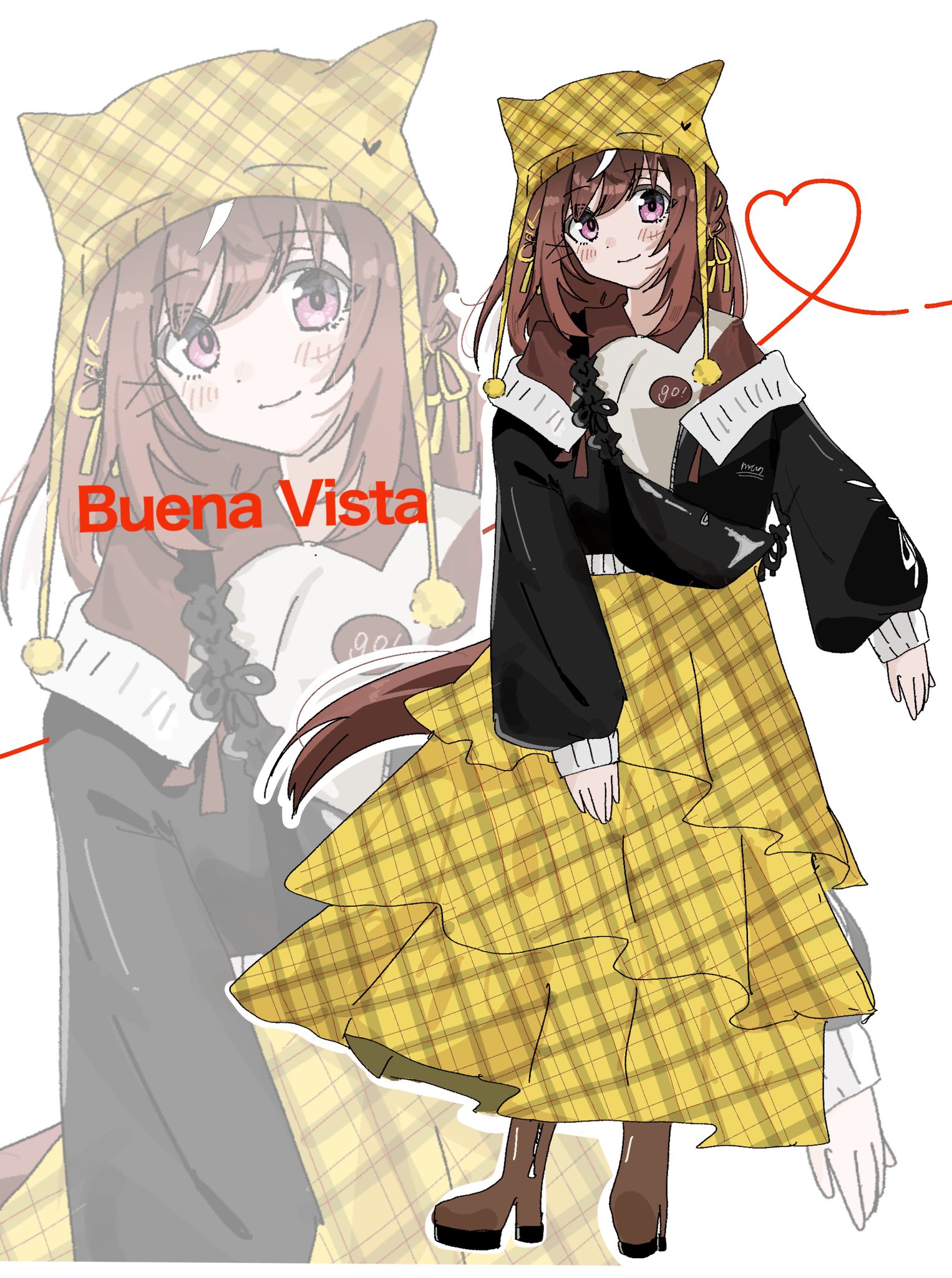 nieto tokage, gentildonna (umamusume), umamusume, translation request, 1girl, alternate costume, brown hair, cheerleader, crop top, drill hair, heart-shaped ornament, heart ear ornament, holding, holding pom poms, navel, pom pom (cheerleading), pom poms, red eyes, simple background, solo, speech bubble, white background