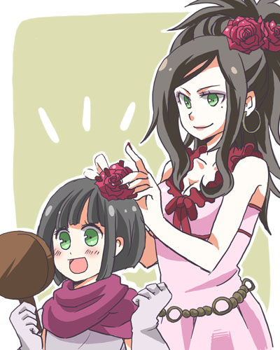 2girlsage differenceblack hairflowerglovesgreen eyeshair flowerhair ornamentmirrormolemole under eyemother and daughtermultiple girlsroseshort hairsmile