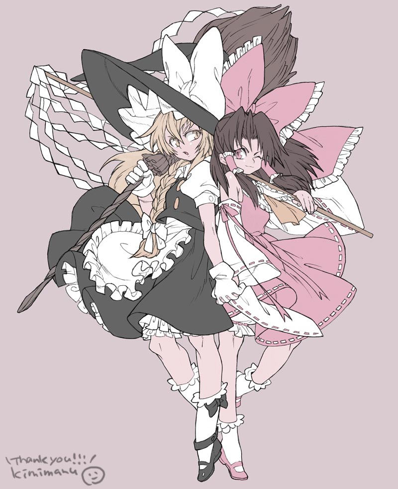 2girlsblonde hairbowbroomfemale focusglovesgoheihair bowhatholding handsjapanese clothesmikomultiple girlsoonusaribbontamazakurawitchwitch hat