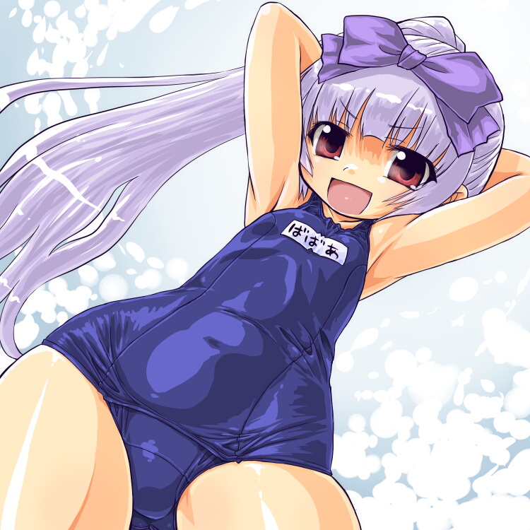 1girlarmpitsfemale focusflat chesthair ribbonlolilong hairone-piece swimsuitponytailpurple hairribbonschool swimsuitshiny clothessoloswimsuitwetwet clothes